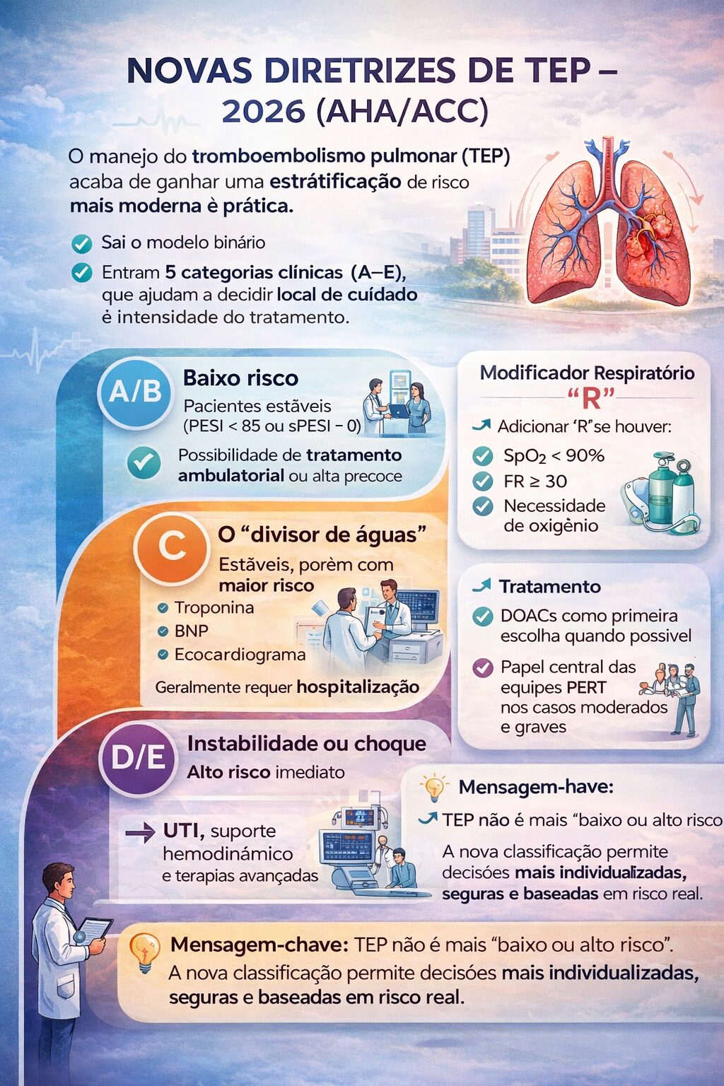 As novas diretrizes propõem cinco categorias clínicas (A–E) para classificar o risco no manejo do TEP agudo, substituindo o modelo binário antigo.